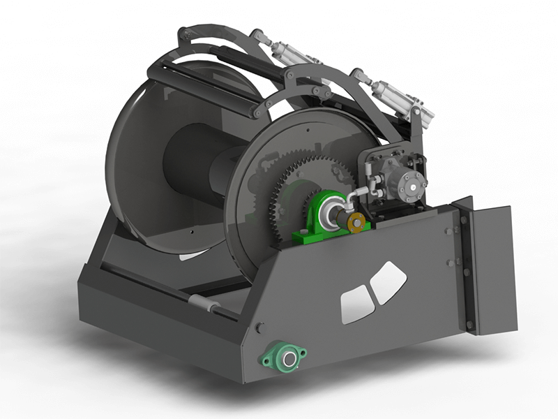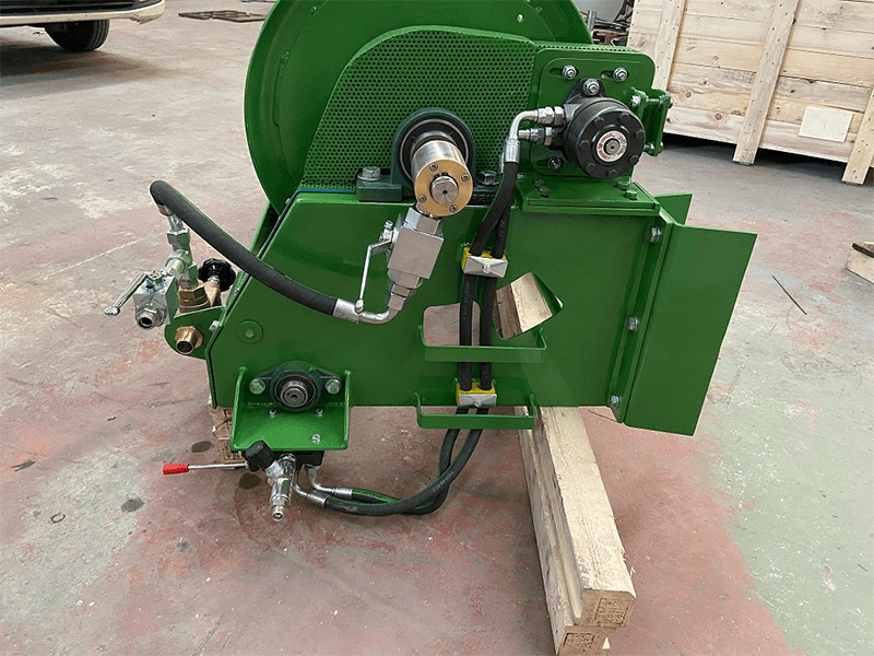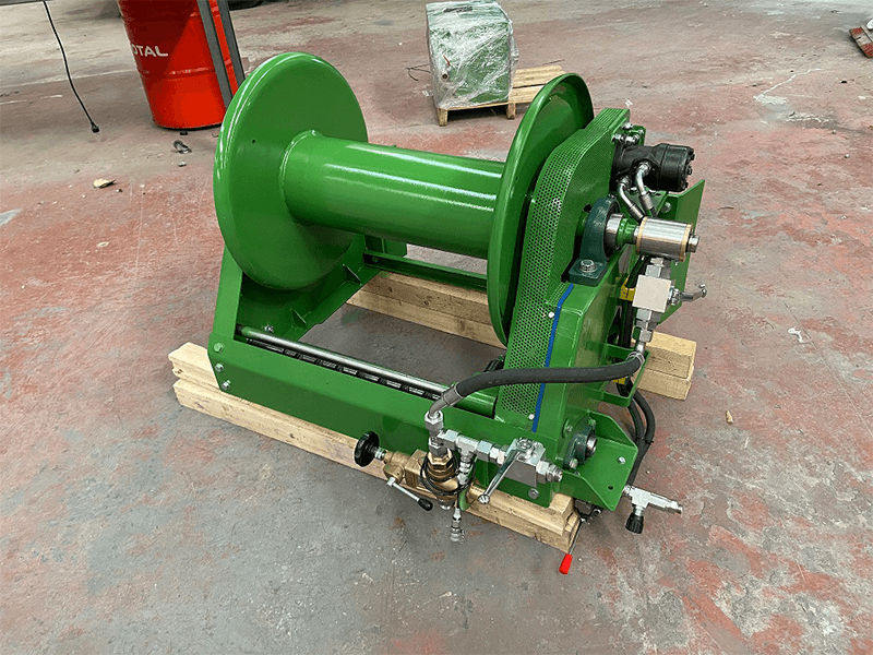 L'enrouleur de tuyau fixe se compose d'un cadre en acier sur lequel est installé un tambour de rotation hydraulique en métal. L'enrouleur a été conçu pour contenir et transporter des tuyaux, en particulier des tuyaux d'eau à haute pression.
