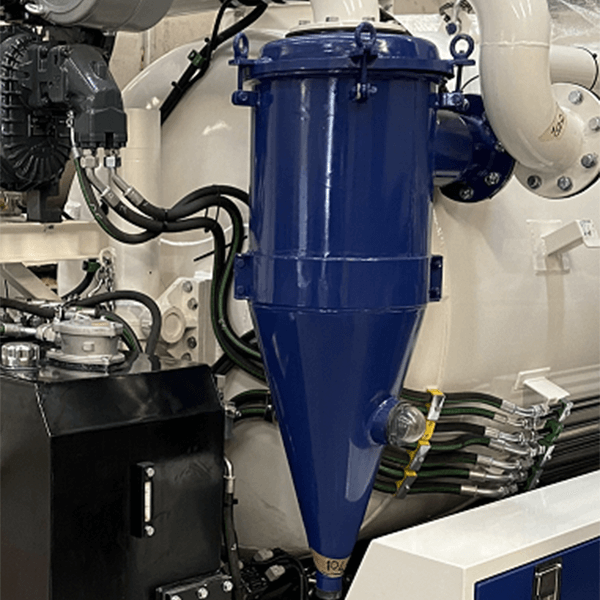 Le epurateur vertical et le piège à humidité sont conçus pour être installés en correspondance avec la ligne d'admission des décompresseurs utilisés pour créer le vide à l'intérieur des réservoirs. Le epurateur vertical et le piège à humidité empêchent les corps étrangers (liquides ou solides) qui pourraient passer au-delà de l'arrêt primaire de pénétrer à l'intérieur du décompresseur en bloquant la ligne d'admission avec une bille flottante en acier inoxydable. Le cyclone est constitué d'un cylindre vertical, qui reçoit tangentiellement le flux à laver à grande vitesse. Sous l'effet de la force centrifuge, les différents éléments contenus à l'intérieur du fluide sont séparés selon leur densité. Le fluide épuré est évacué par la sortie axiale supérieure, tandis que la matière à récupérer est collectée dans la partie conique inférieure du cyclone et évacuée après chaque travail.